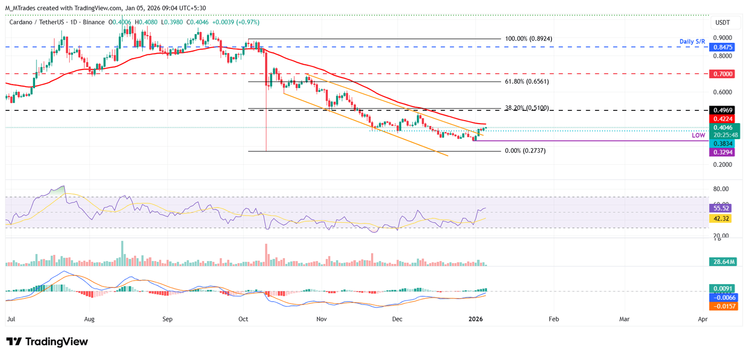 El precio de Cardano rompió y cerró por encima de la línea de tendencia superior del patrón de cuña descendente (formado al conectar múltiples máximos y mínimos con dos líneas de tendencia desde mediados de octubre) el viernes y subió ligeramente hasta el domingo. A partir del lunes, ADA se cotiza alrededor de 0.40$.
