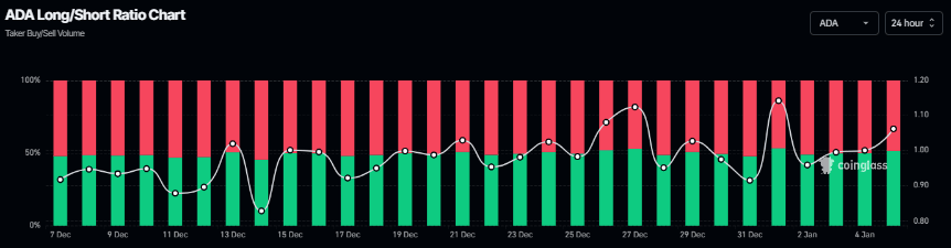 Además, la relación larga-corta de Cardano en Coinglass ha estado aumentando constantemente y se sitúa en 1.06 el lunes, acercándose a su máximo mensual. Esta relación, por encima de uno, refleja un sentimiento alcista en los mercados, ya que más operadores están apostando a que el precio de ADA suba.