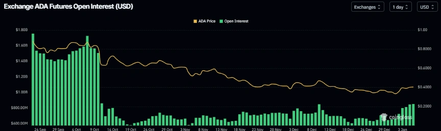 Los datos de CoinGlass muestran que el OI de futuros de Cardano en los intercambios aumentó a 851.17 millones de dólares el lunes desde 644.34 millones de dólares el martes, alcanzando el nivel más alto desde mediados de diciembre. Un OI en aumento representa dinero nuevo o adicional ingresando al mercado y nuevas compras, lo que podría alimentar el actual repunte del precio de ADA.