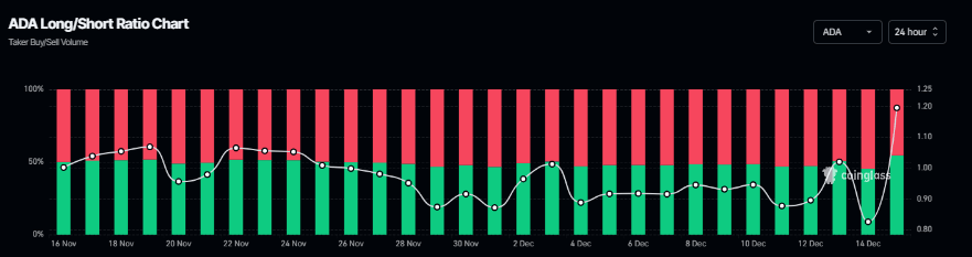 En el lado de los derivados, la relación larga-corta de CoinGlass para ADA es de 1.19, el nivel más alto en más de un mes. La relación por encima de uno sugiere un sentimiento alcista en el mercado, ya que los operadores están apostando a que el precio del activo suba.