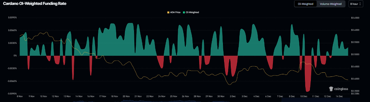 Además, los datos de la tasa de financiación de Cardano indican un posible repunte. Según los datos de la Tasa de Financiación Ponderada por OI de Coinglass, el número de operadores que apuestan a que el precio de Cardano caerá más es menor que aquellos que anticipan un aumento de precio.