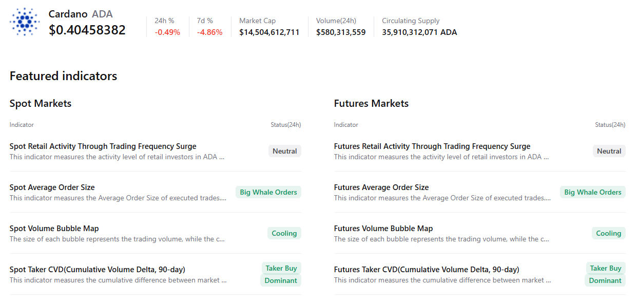Los datos resumidos de CryptoQuant apuntan a una perspectiva alcista, ya que los mercados al contado y de futuros de Cardano muestran grandes órdenes de ballenas, condiciones de enfriamiento y dominio de compra. Todos estos factores señalan un sentimiento en mejora entre los operadores, insinuando un posible repunte en los próximos días.