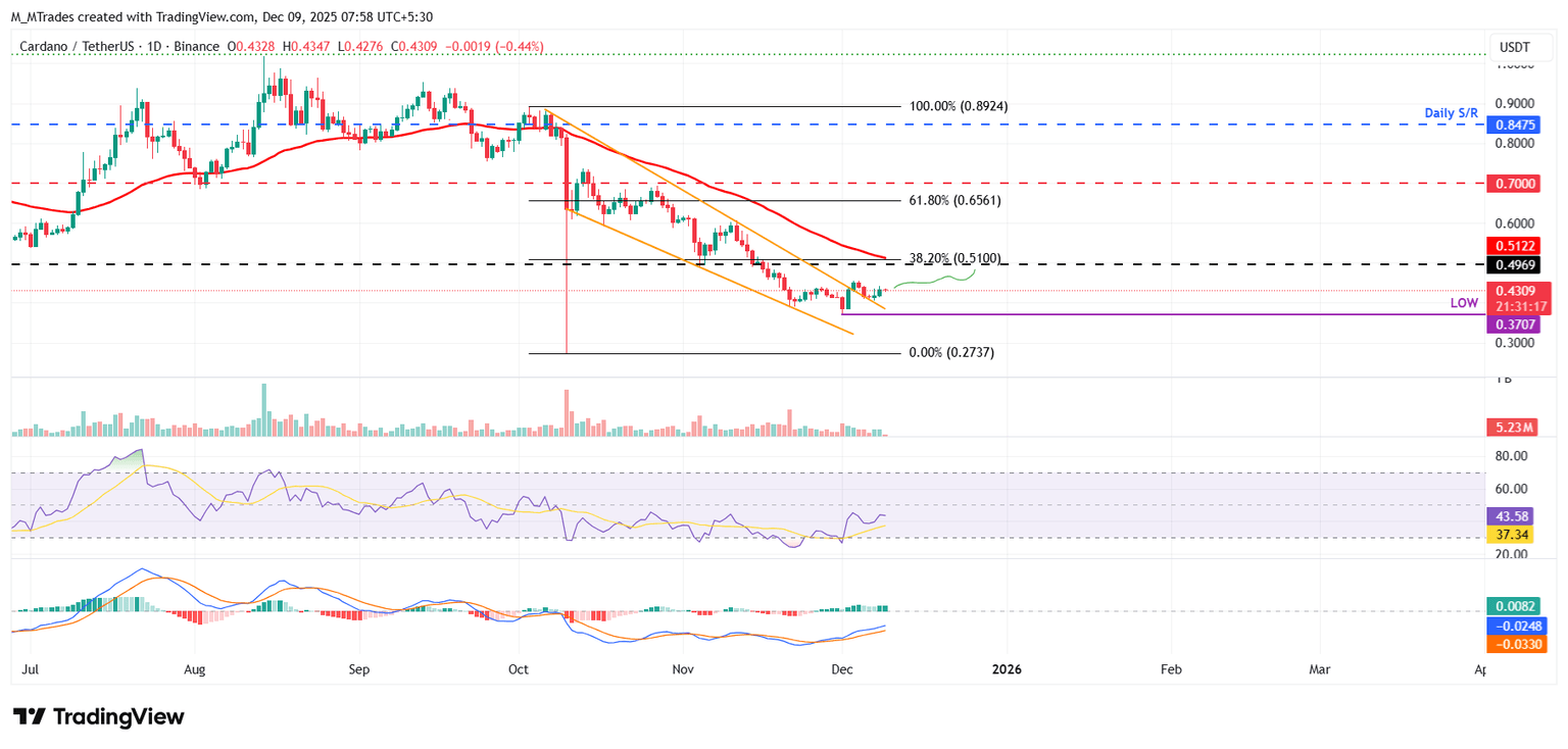 - El precio de Cardano se estabiliza alrededor de 0.43$ el martes, después de haber subido un 3.71% en la semana anterior.