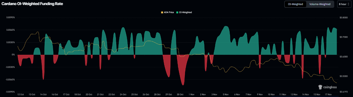 Aparte de las condiciones infravaloradas, los datos de derivados también apoyan un repunte de recuperación para Cardano. Los datos de Tasa de Financiación Ponderada por OI de Coinglass muestran que el número de traders apostando a que el precio de ADA caerá más es menor que aquellos que anticipan un aumento de precio.