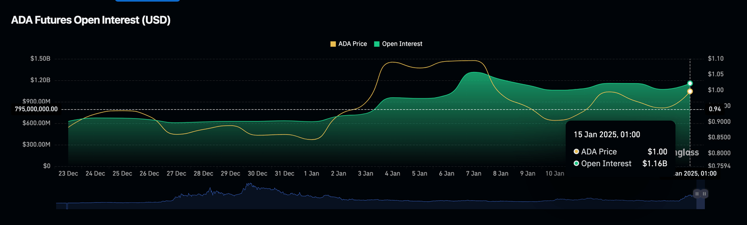 - El interés abierto de ADA aumentó en 90 millones de dólares en las últimas 24 horas, lo que sugiere más potencial alcista por delante.