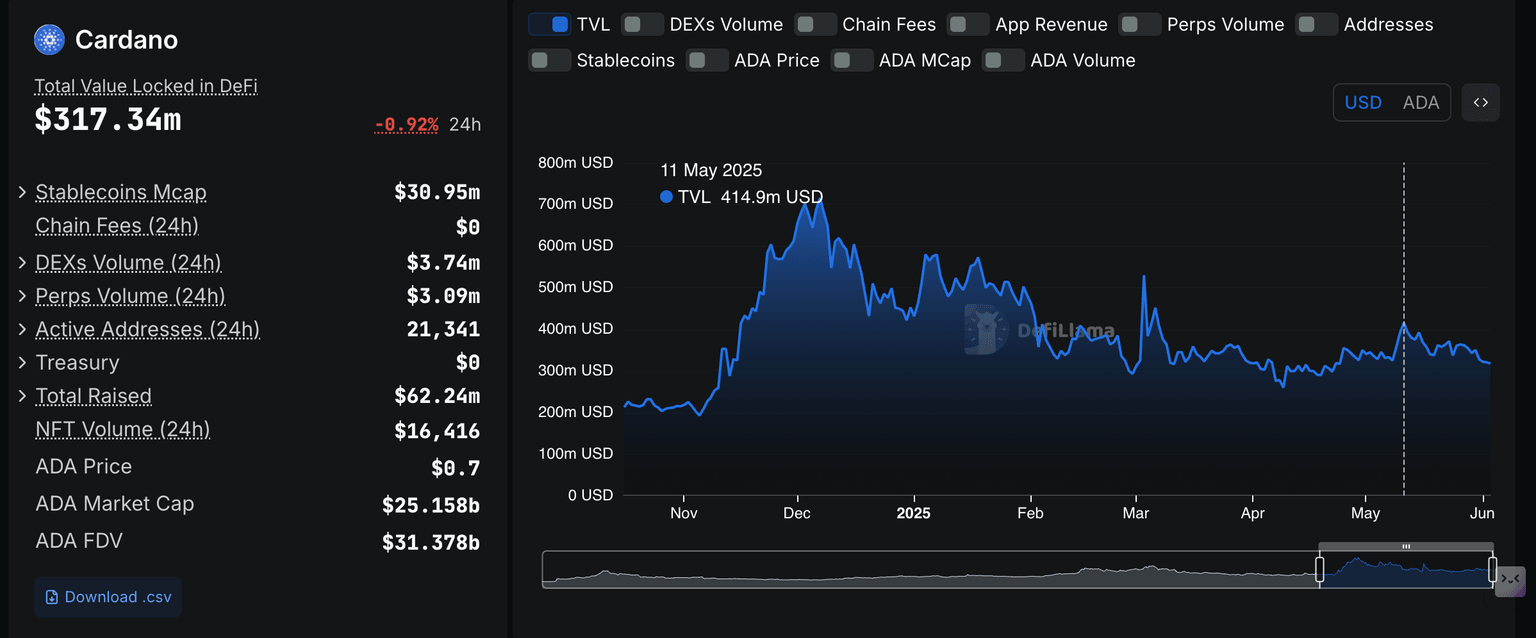 Al mismo tiempo, la caída persistente en el Valor Total Bloqueado (TVL) DeFi de Cardano a aproximadamente 317 millones de dólares, después de alcanzar brevemente un pico de alrededor de 414 millones de dólares el 11 de mayo, muestra que la confianza de los inversores en el ecosistema está disminuyendo.