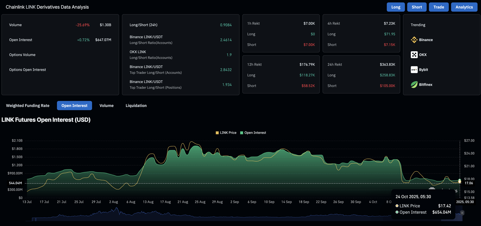 En medio de la recompra, la demanda minorista de Chainlink se mantiene apagada según los datos de interés abierto de futuros de LINK de CoinGlass, estancándose en 654,04 millones de dólares. La tendencia lateral en el OI de LINK tras el colapso del 10 de octubre sugiere un sentimiento de aversión al riesgo prolongado, con los operadores evitando un apalancamiento mayor o añadiendo nuevas posiciones largas.