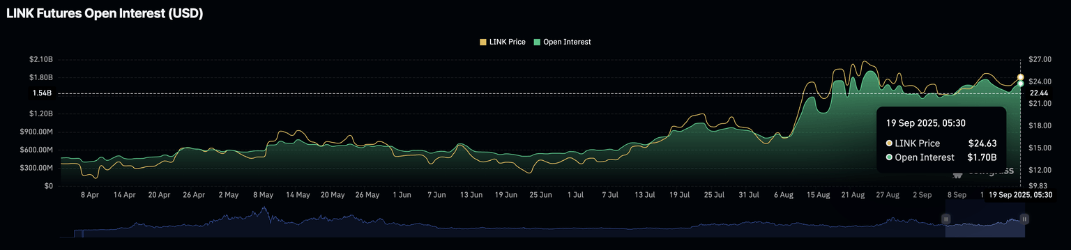 Validando la elevada demanda, el Interés Abierto (OI) de LINK se sitúa en 1.700 millones de dólares, por debajo de 1.770 millones de dólares el jueves. A pesar de la disminución, el OI de LINK sigue siendo elevado, manteniendo una fase de recuperación a corto plazo después de rebotar desde el nivel de 1.500 millones de dólares a principios de septiembre.