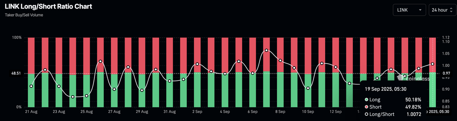 Los datos de CoinGlass muestran que las apuestas alcistas en LINK han aumentado constantemente al 50,18% en los últimos tres días, desde el 48,89% el miércoles. Esto indica un aumento significativo en el apetito de riesgo entre los inversores.