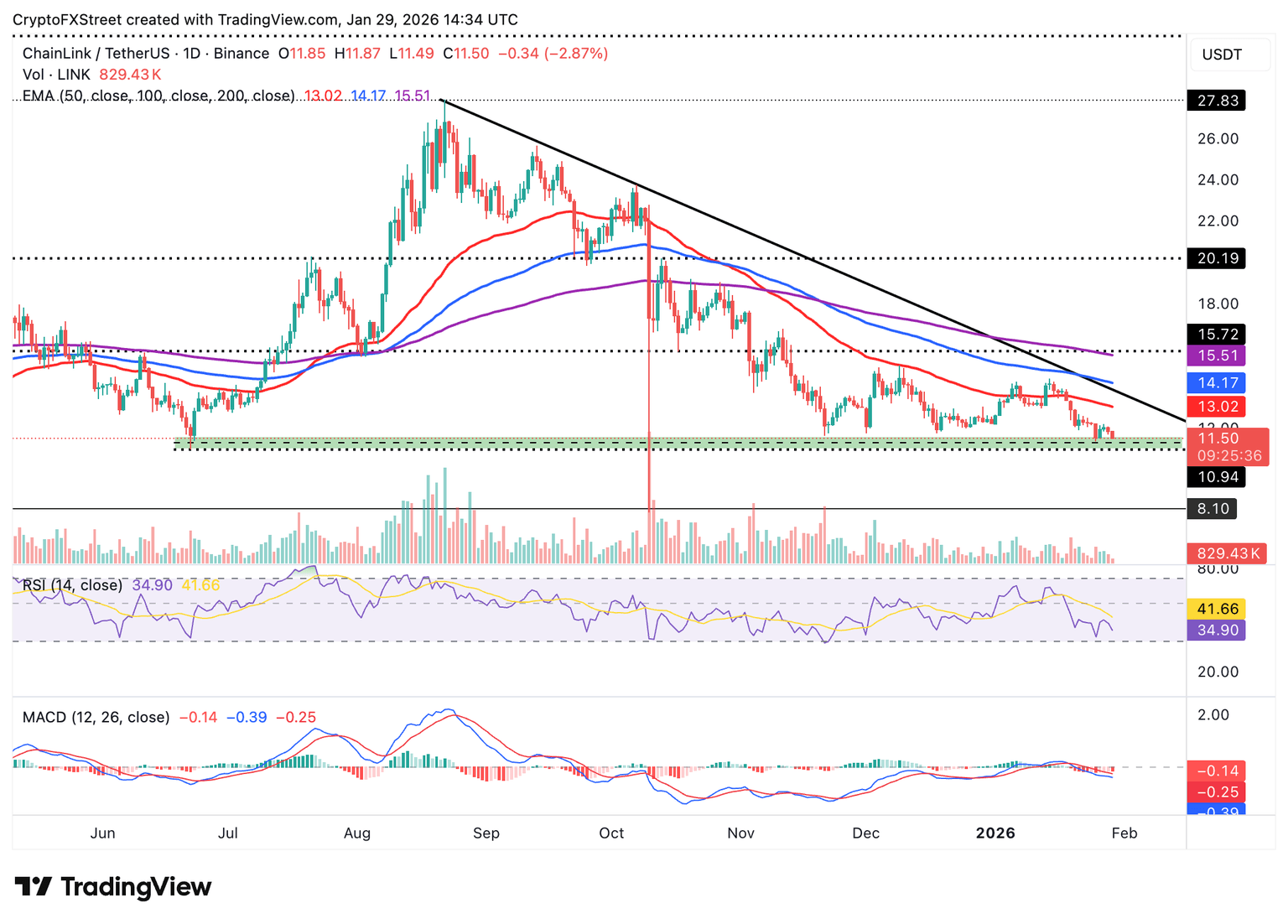 Chainlink está operando a la baja pero se mantiene por encima de 11.00$ mientras los indicadores muestran señales bajistas, alineándose con el débil sentimiento en el mercado de criptomonedas en general. El Índice de Fuerza Relativa (RSI) en 35 en el gráfico diario está cerca del territorio de sobreventa, preservando la perspectiva bajista.
