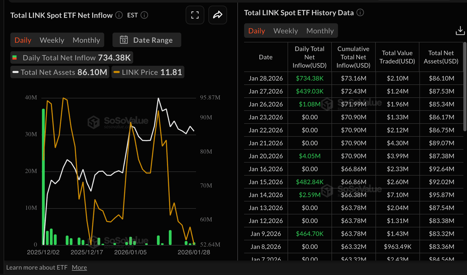 A pesar de que los inversores minoristas se mantienen al margen, Chainlink está atrayendo el interés de inversores institucionales a través de fondos cotizados en bolsa (ETFs). Los inversores que buscan ETFs basados en altcoins depositaron aproximadamente 734.000$ en ETFs de LINK al contado, llevando el total acumulado de flujos a 73 millones de dólares y los activos bajo gestión a 86 millones de dólares.