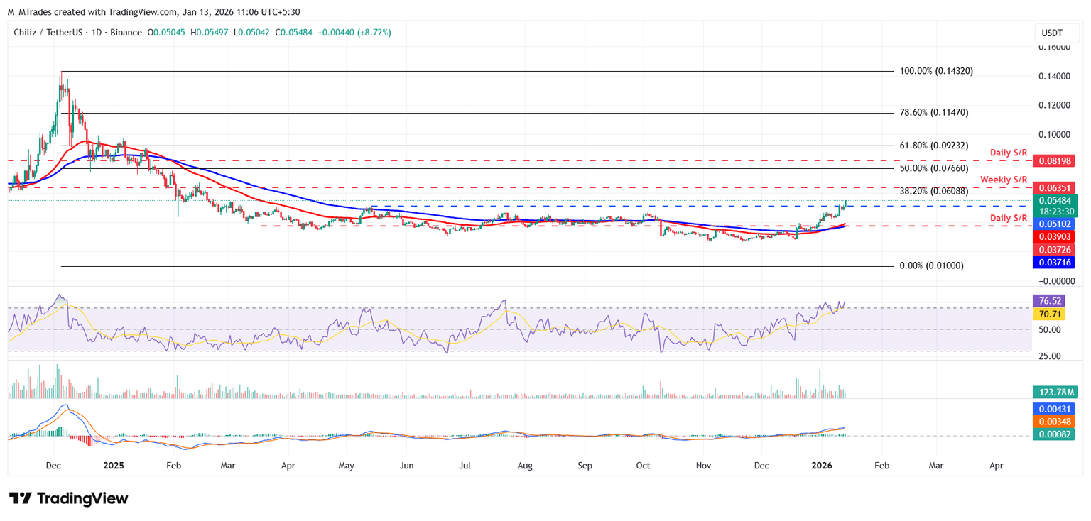 Pronóstico de Chiliz: CHZ extiende el repunte por encima de 0.054$ a pesar de las señales de sobrecalentamiento en cadena