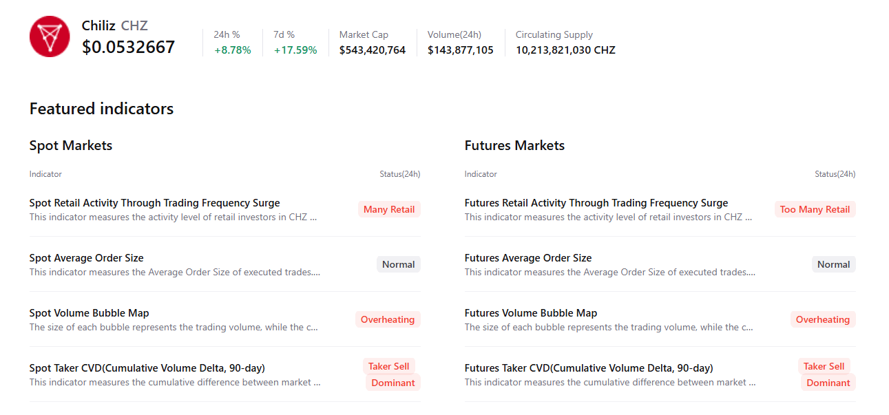 A pesar del aumento continuo del precio, los datos resumidos de CryptoQuant respaldan una perspectiva bajista para CHZ. Los datos indican que tanto los mercados al contado como los de futuros muestran signos de actividad minorista y sobrecalentamiento, sugiriendo una posible corrección en el futuro.