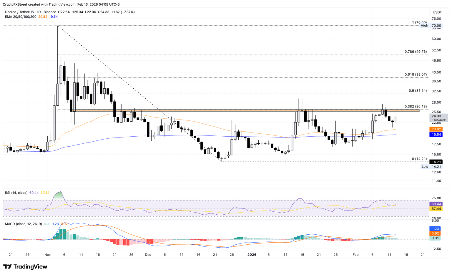 - Decred ha subido más del 7% hasta ahora el viernes, acercándose a la zona de resistencia crítica cerca de 26$.