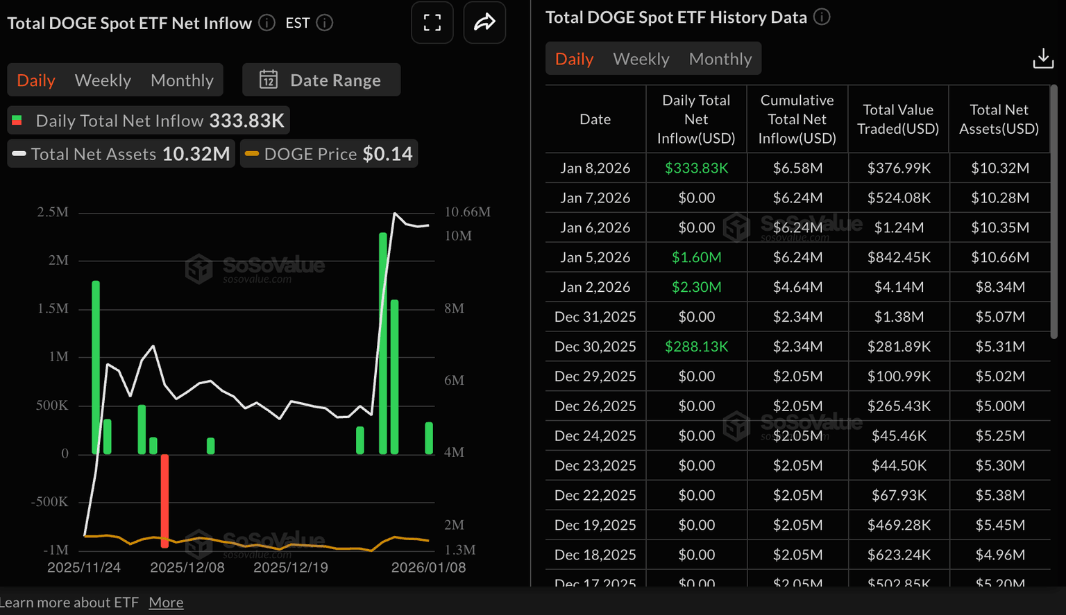Mientras tanto, los ETFs al contado de Dogecoin registraron una entrada menor de casi 334.000$ el jueves, a pesar de la volatilidad elevada en el mercado de criptomonedas esta semana.