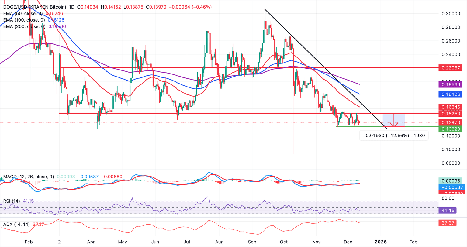 XRP está cotizando a 0.1397$ y permanece por debajo de la media móvil exponencial (EMA) de 50 días en 0.1625$, EMA de 100 días en 0.1813$ y EMA de 200 días en 0.1957$, manteniendo la tendencia general bajista. El indicador de Convergencia/Divergencia de Medias Móviles (MACD) se mantiene marginalmente por encima de la línea de señal (roja), mientras que las barras de histograma verdes se contraen en el gráfico diario, sugiriendo un desvanecimiento del impulso alcista. Dogecoin podría extender la tendencia a la baja por debajo del soporte en 0.1332$ si el Índice de Fuerza Relativa (RSI) en 41 desciende aún más.