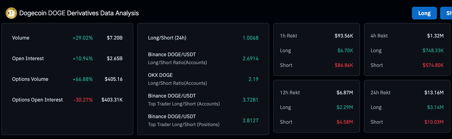 - El interés abierto del mercado de derivados de Dogecoin aumenta a 2.650 millones de dólares junto con el aumento en el volumen de operaciones a 7.200 millones de dólares.