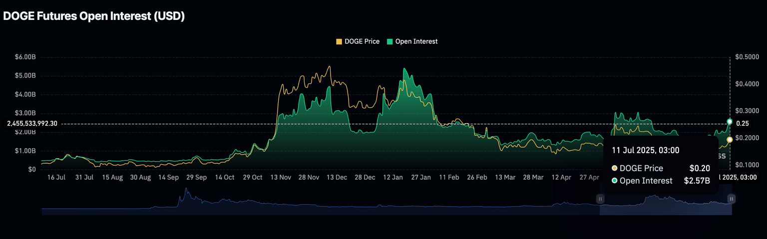 El interés abierto de futuros de Dogecoin, que representa el valor de todos los contratos de futuros y opciones que no han sido liquidadas o cerradas, se sitúa en 2.57 mil millones de dólares, según datos de CoinGlass.