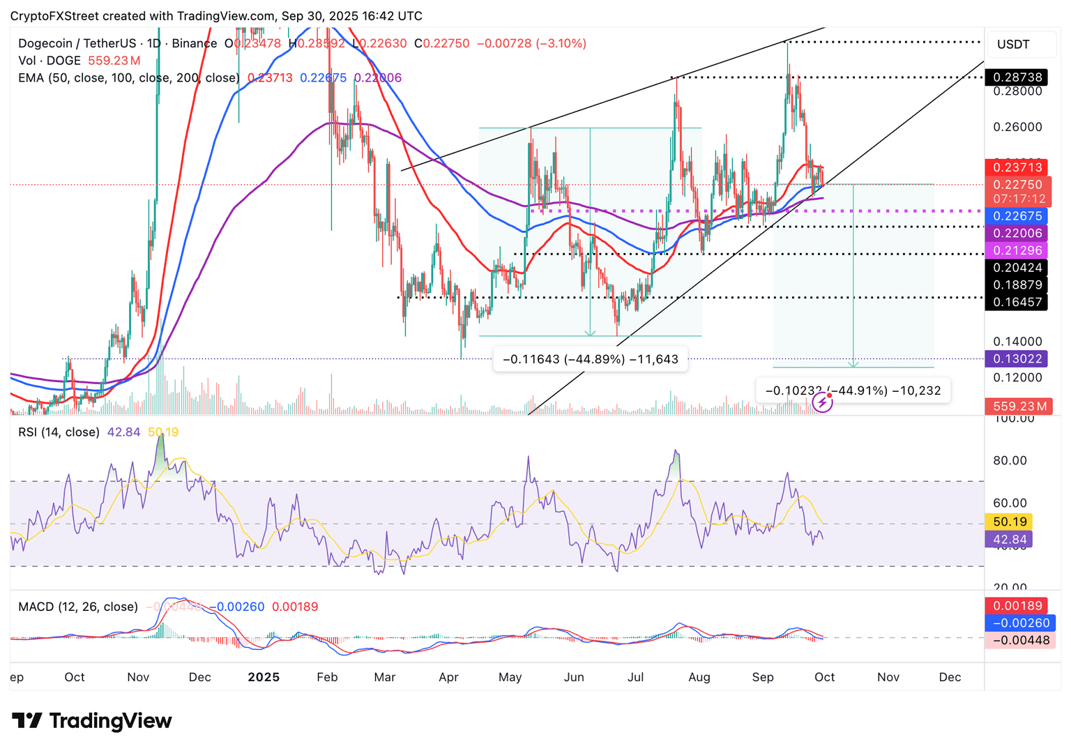 - DOGE está al borde de una ruptura del patrón de cuña ascendente, aumentando el riesgo a la baja hacia 0.2000$.