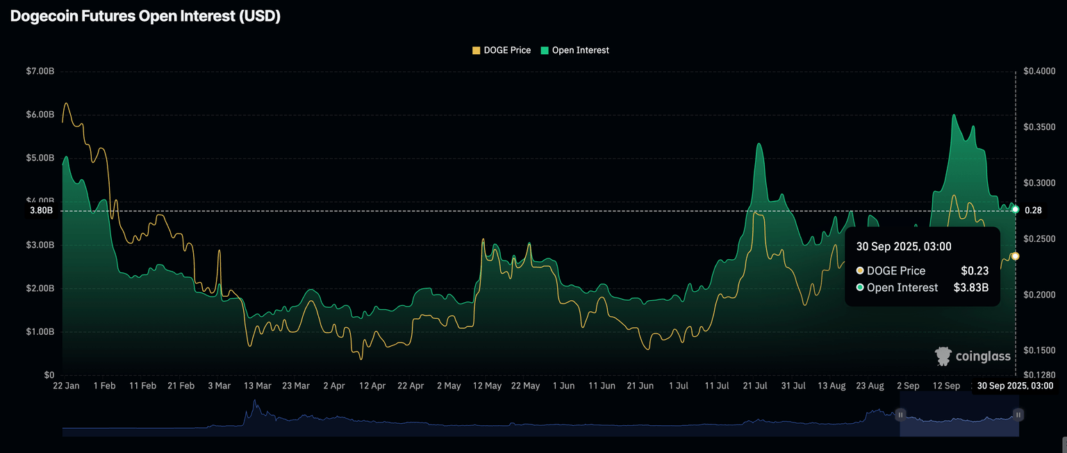 Dogecoin ha experimentado una notable disminución en el interés minorista desde mediados de septiembre. Según datos de CoinGlass sobre los mercados de derivados, el interés abierto (OI) de futuros, que actualmente promedia 3.83 mil millones de dólares, alcanzó un pico de 6 mil millones de dólares el 14 de septiembre.