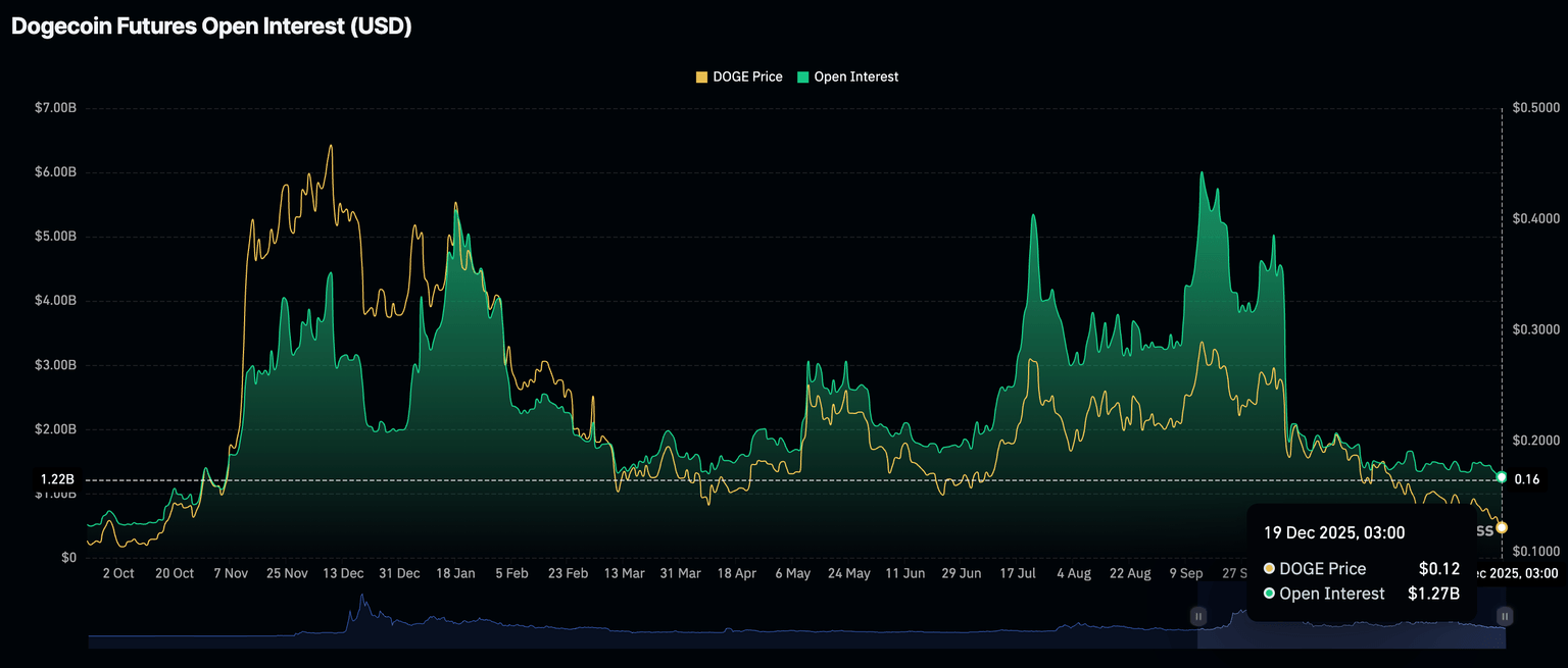 El interés en Dogecoin ha disminuido significativamente desde el desplome del 10 de octubre, con el interés abierto de futuros (OI) cayendo aproximadamente un 71% a 1.21 mil millones de dólares el viernes desde 4.4 mil millones.