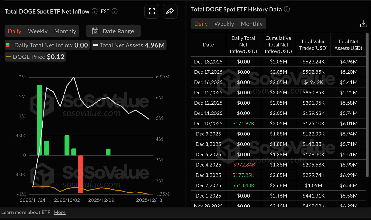 - Los ETF de DOGE al contado quedan en segundo plano, sin entradas registradas desde el 10 de diciembre.