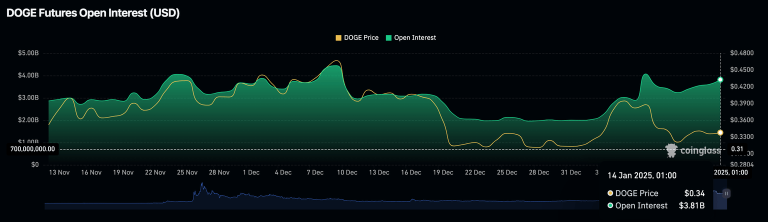 Esto lleva el interés abierto total en los contratos de futuros de DOGE a 3.81 mil millones de dólares a partir del 14 de enero, según datos de Coinglass.