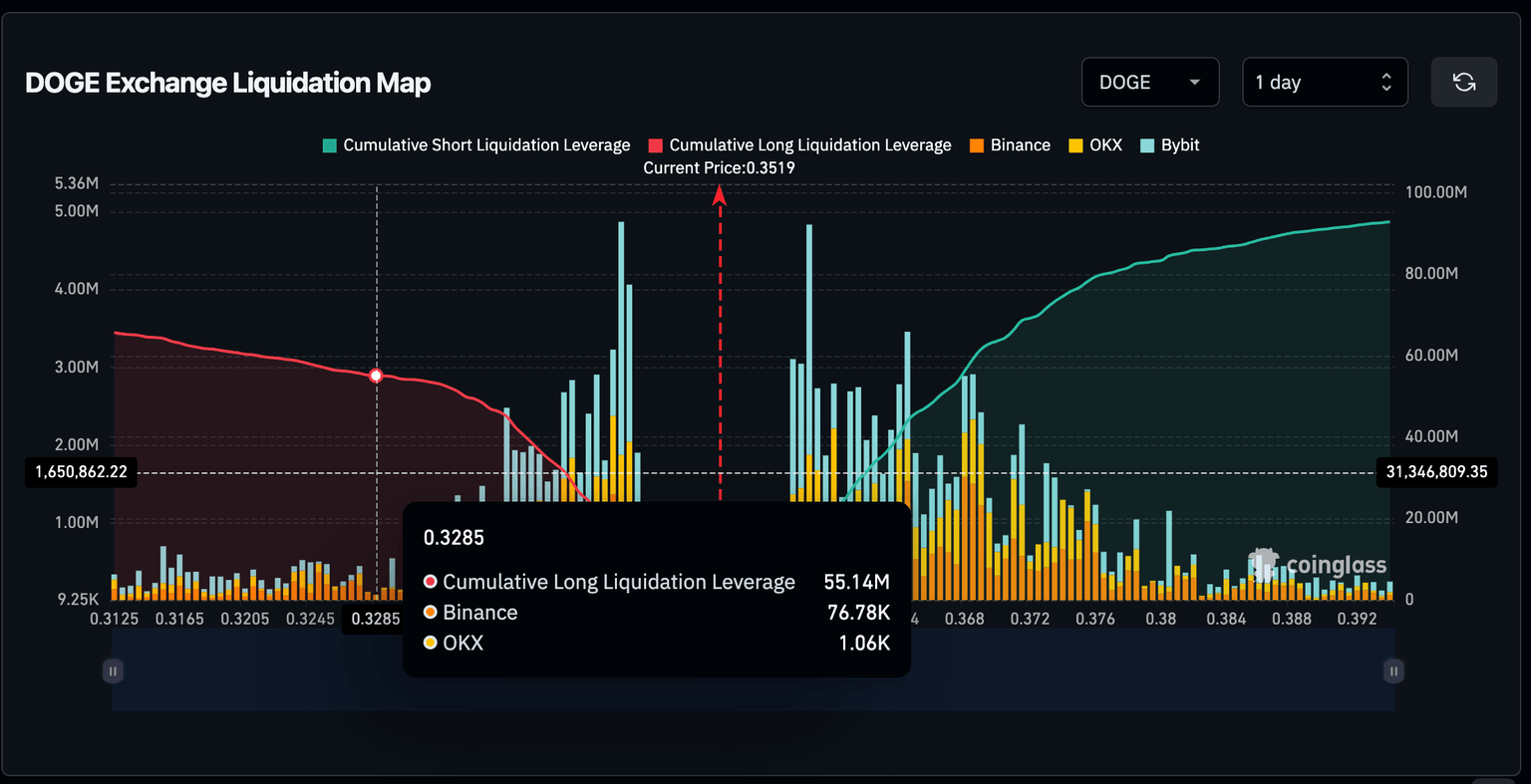 Esto indica que los operadores alcistas podrían enfrentar liquidaciones que totalizan 55 millones de dólares si el precio de Dogecoin cae por debajo de 0.33$.