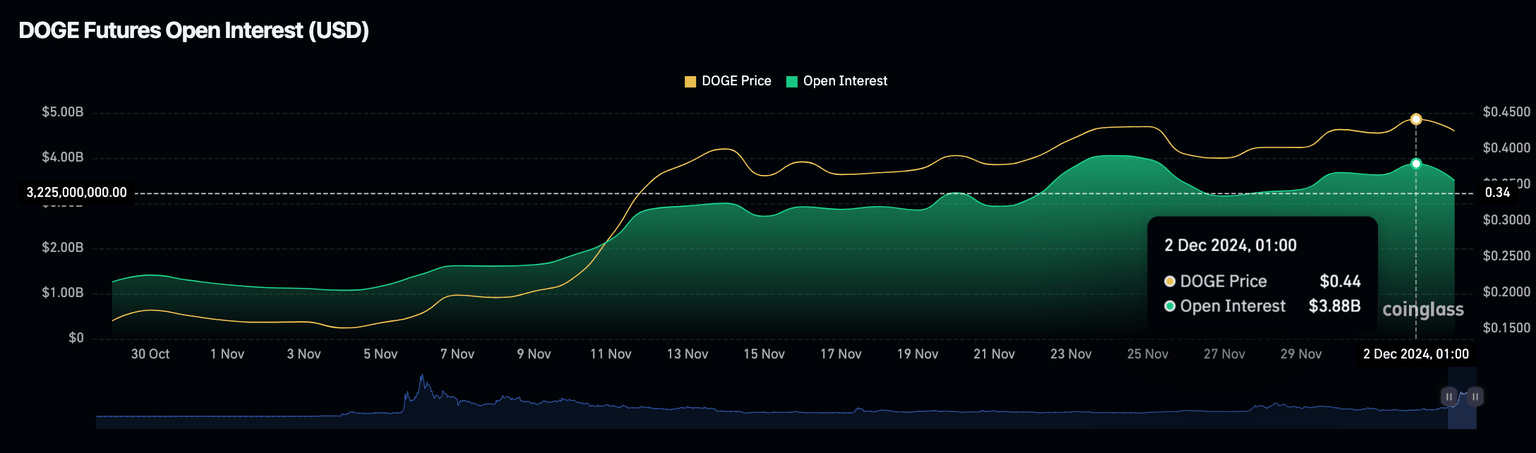 El gráfico anterior muestra que el interés abierto de DOGE ha caído de 3.88 mil millones de dólares a 3.50 mil millones de dólares en las últimas 24 horas.