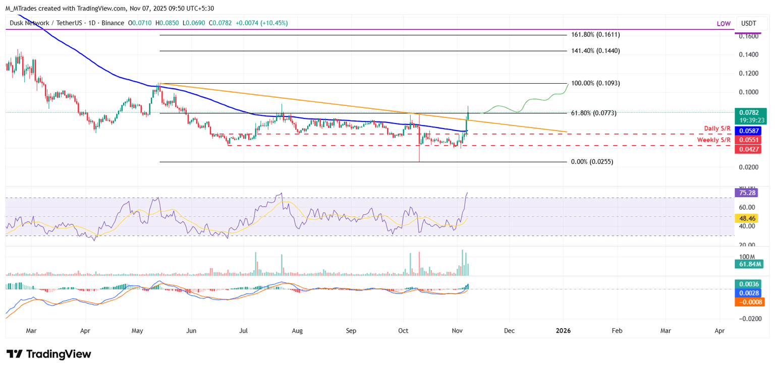 El precio de DUSK encontró soporte en el nivel semanal de 0.042$ el lunes y subió más del 50% en los siguientes tres días, cerrando por encima de la resistencia diaria en 0.055$ el jueves. En el momento de escribir el viernes, continúa cotizando al alza un 10% alrededor de 0.078$.