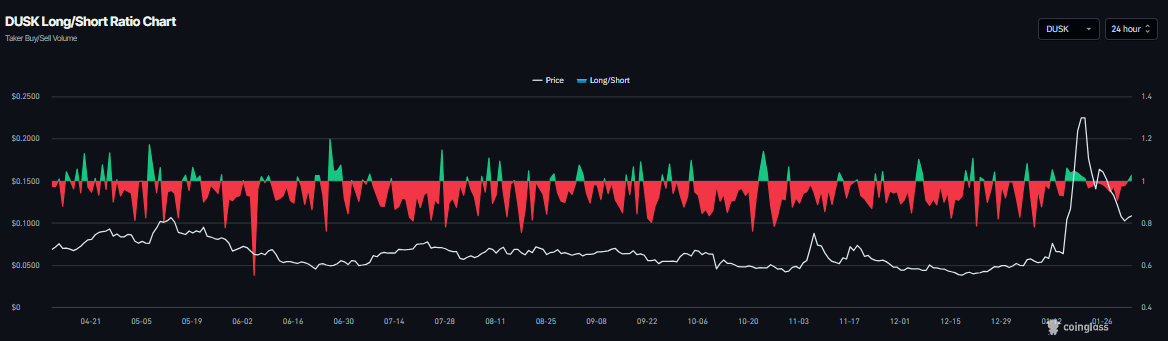 Los datos de CoinGlass muestran que la relación larga-corta de DUSK es de 1.02 el martes y ha estado aumentando de manera constante. La relación por encima de uno refleja un sentimiento alcista en los mercados, ya que más operadores están apostando a que el precio del activo suba.