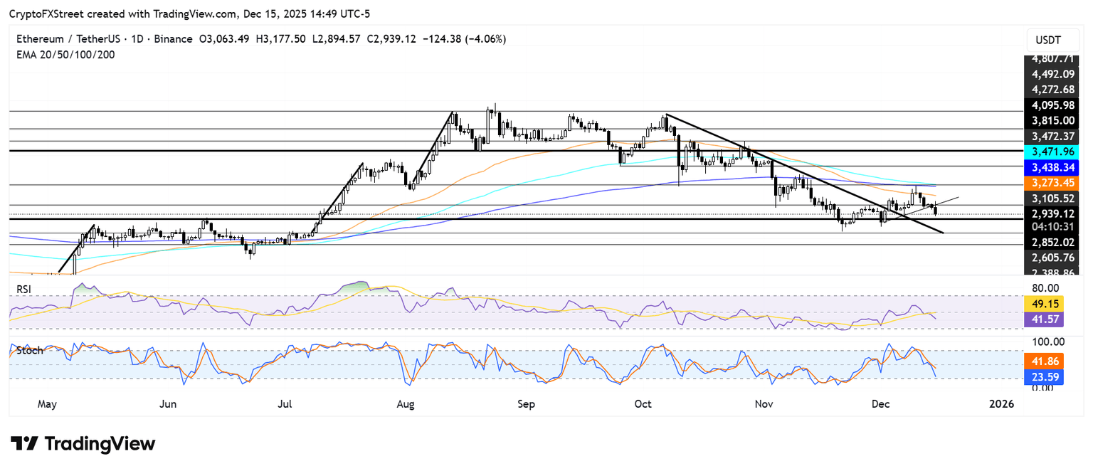 ETH enfrentó un fuerte rechazo al intentar recuperar el nivel de 3.100$. Su precio ha caído un 5% el lunes y se está acercando al nivel de soporte de 2.850$.