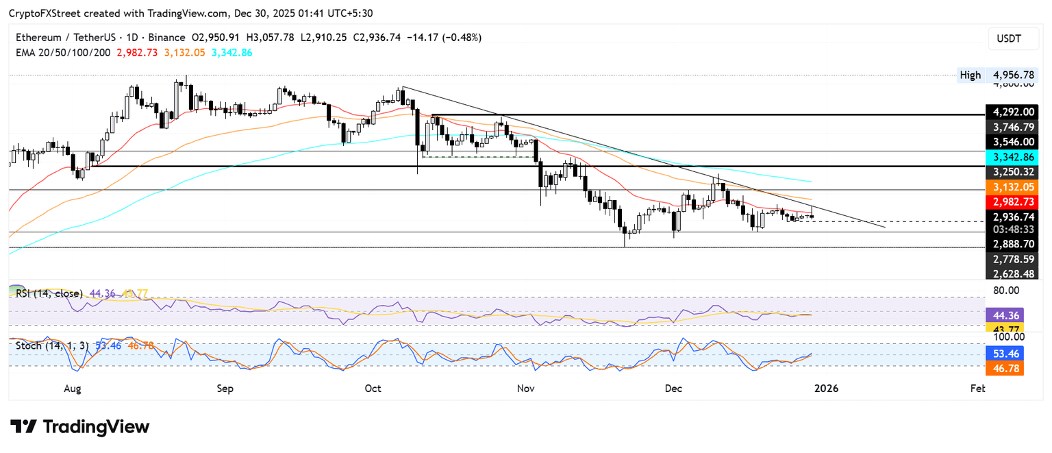 ETH debe mantener el soporte a corto plazo alrededor de 2.880$ y convertir la resistencia del triángulo — cerca de la EMA de 50 días — en una línea de tendencia de soporte antes de que pueda probar el nivel de 3.250$.