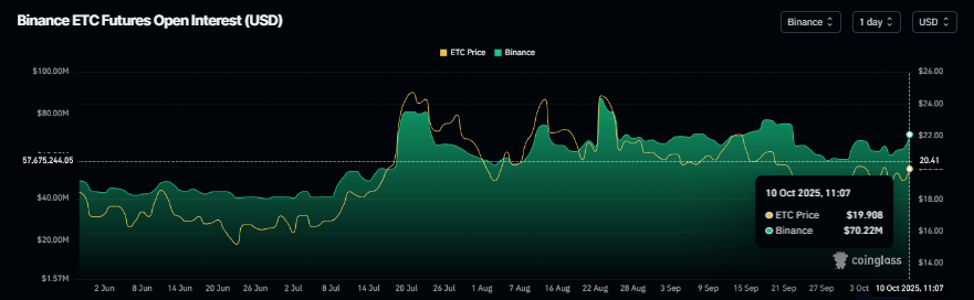 En el lado de los derivados, el Interés Abierto (OI) de los futuros de Ethereum Classic en los intercambios actualmente es de 70.22 millones de dólares, a partir del viernes, y ha estado aumentando de manera constante desde principios de octubre. El aumento del OI representa nuevo o adicional dinero ingresando al mercado y nuevas compras, lo que podría alimentar el actual rally del precio de ETC.