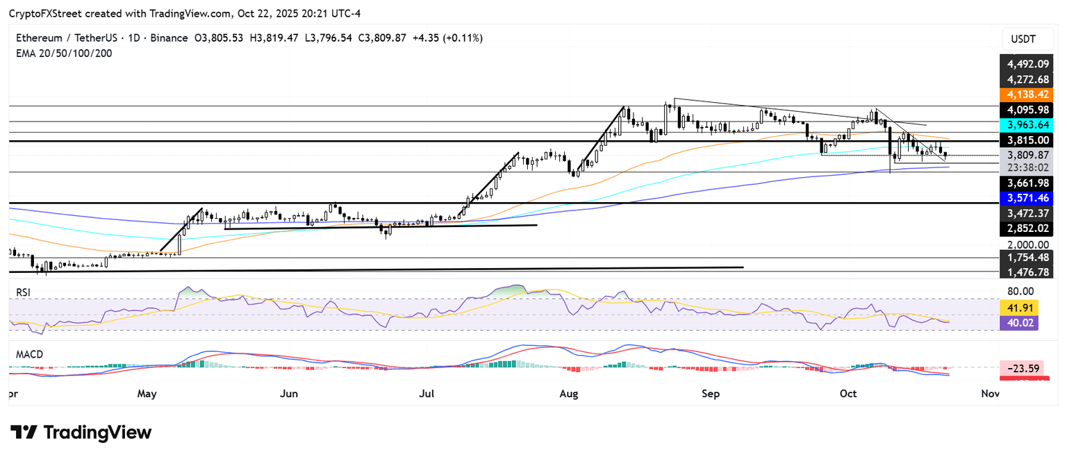 Después de ver un rechazo nuevamente en la resistencia de 4.100$, el ETH cayó brevemente por debajo del soporte cerca de 3.800$ antes de rebotar en la línea de tendencia descendente que se extiende desde el 7 de octubre, justo por encima de la media móvil exponencial (EMA) de 200 días. La altcoin principal está luchando por mantener el soporte mientras persiste la presión bajista.