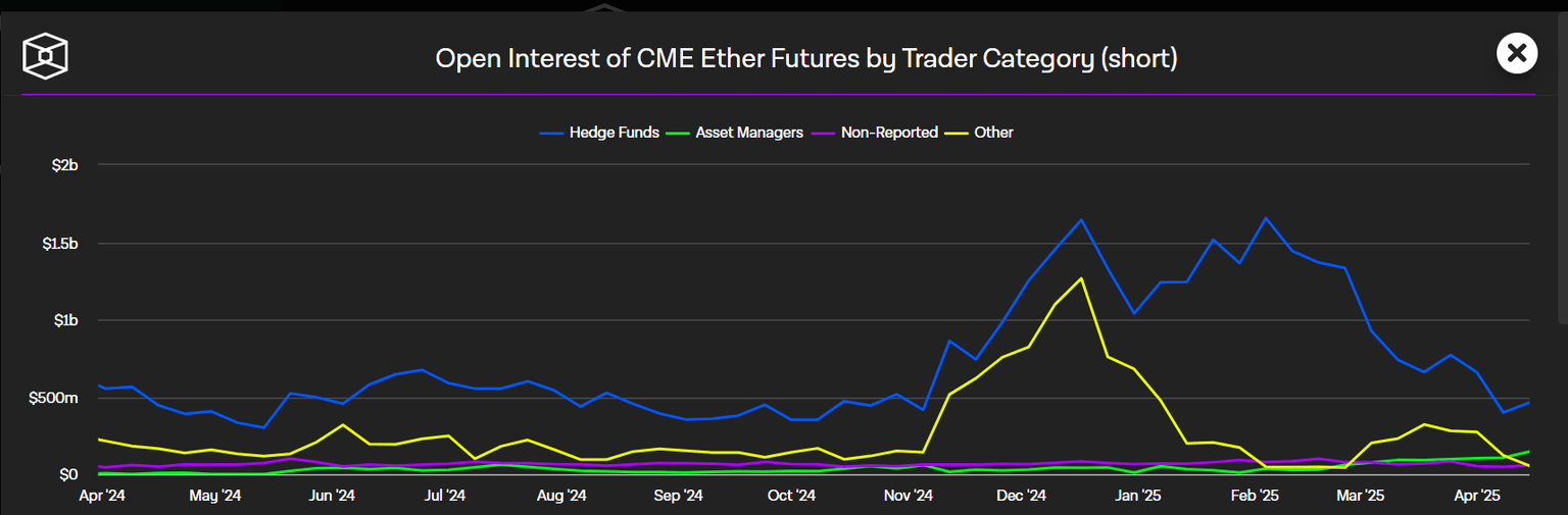 Las posiciones cortas de Ethereum en la CME han disminuido constantemente desde que se implementaron los aranceles de Trump, cayendo por debajo de 500 millones de dólares en todas las categorías de comerciantes por primera vez en 2025.