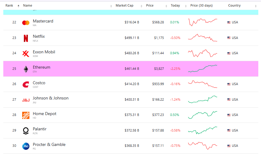 El precio de Ethereum comenzó la semana de manera positiva, disparándose a un nuevo máximo anual (YTD) de 3.941$ el lunes, pero terminó el día con una ligera corrección. Hasta ahora en julio, ETH ha subido más del 54%, y su capitalización de mercado ahora supera los 460.000 millones de dólares, colocándolo entre los 25 activos más grandes del mundo, superando a empresas como Costco y Johnson & Johnson.