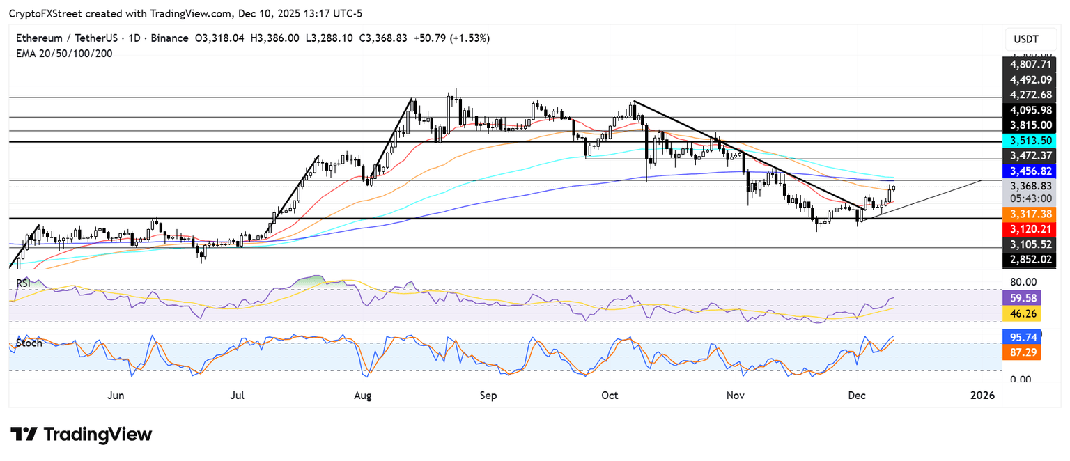 Pronóstico del precio de Ethereum: ETH reintenta un movimiento hacia 3.470$