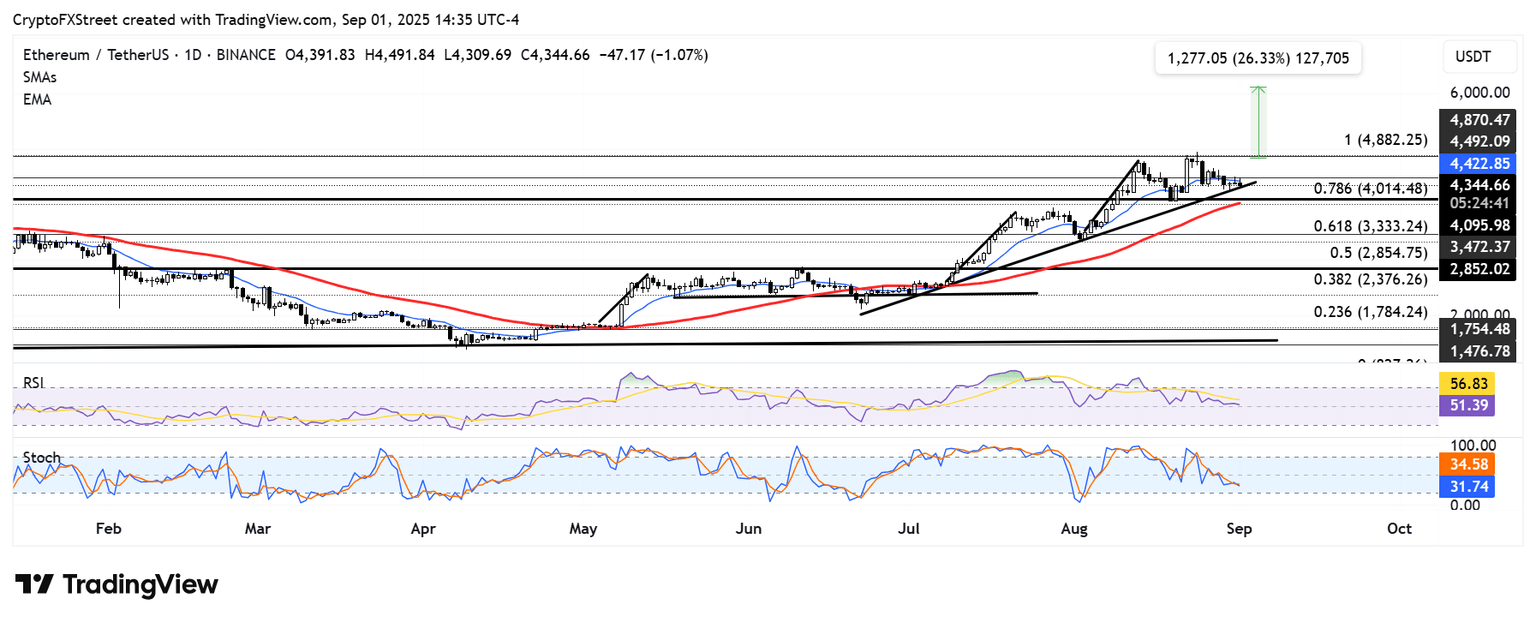 Ethereum (ETH) cotiza alrededor de 4.300$ el lunes después de atraer casi 8.000 millones de dólares en entradas de capital a través de una rotación de ballenas de Bitcoin de 4.000 millones de dólares y 3.950 millones de dólares en productos de inversión en ETH a lo largo de agosto.