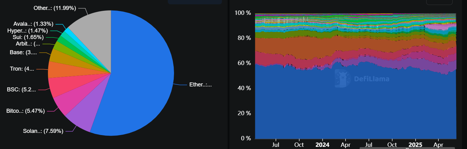 Ethereum alberga la mayoría de los mercados globales de DeFi y stablecoins: más del 55% del valor total bloqueado (TVL) y el 50% del suministro global de stablecoins, según datos de DefiLlama.