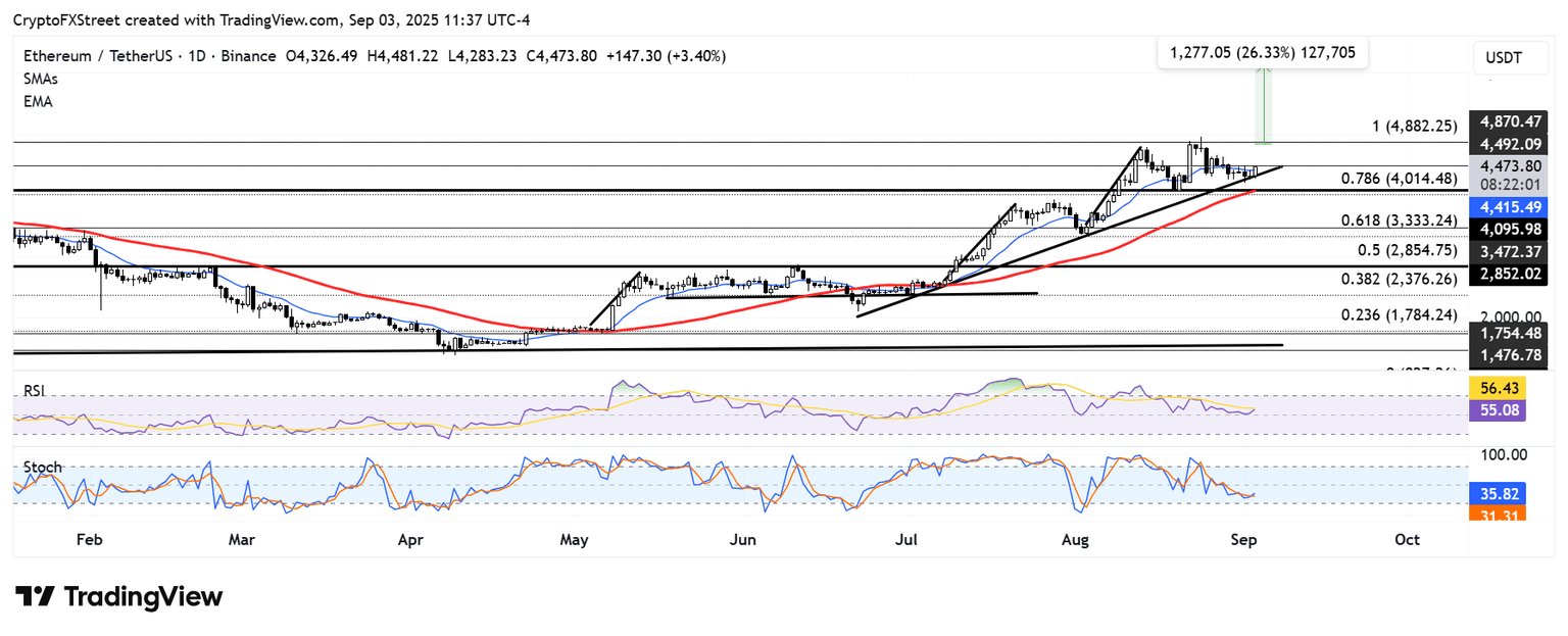 Pronóstico de Ethereum: ETH rebota en el soporte de la línea de tendencia, prueba el nivel clave de 4.500$