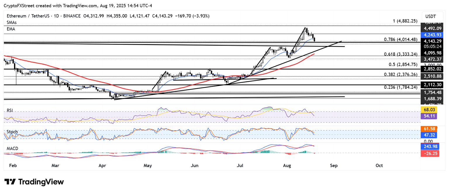 Ethereum está probando el soporte de 4.100$ después de caer por debajo de la media móvil exponencial (EMA) de 14 días, marcando un giro brusco desde su tendencia alcista de hace más de una semana.