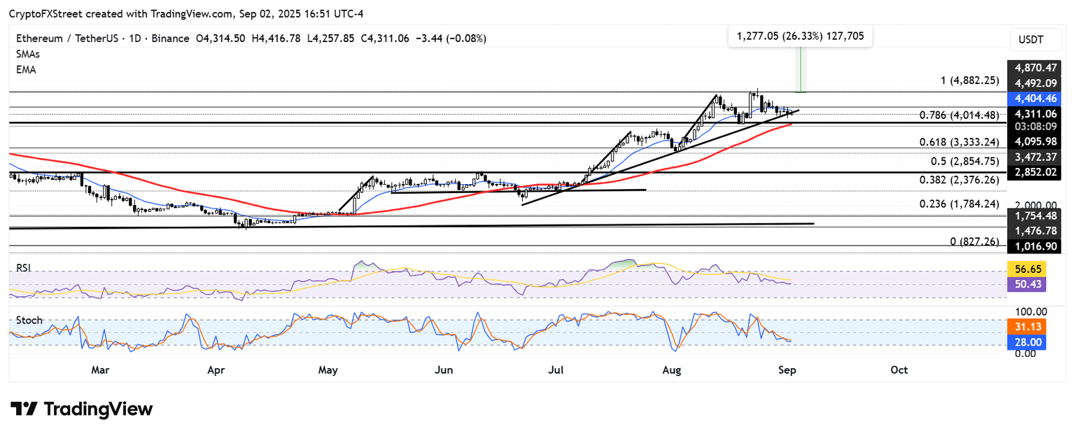 ETH está luchando por mantener un soporte clave de línea de tendencia ascendente después de caer por debajo de él por primera vez desde el 22 de junio. A medida que los toros y los osos luchan en la línea de tendencia, los inversores están observando el rango de soporte clave entre 4.000$ y 4.100$, que está fortalecido por la Media Móvil Exponencial (EMA) de 50 días.