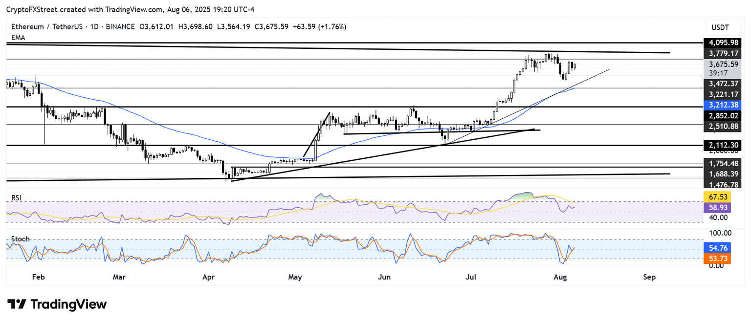 La principal altcoin ha estado consolidándose en gran medida dentro del rango de 3.400$ y 3.800$ desde el 21 de julio, después de un rally de dos semanas que abarcó del 8 al 20 de julio. La consolidación podría marcar la formación de un banderín alcista si ETH continúa cotizando por encima del soporte de 3.220$, que está reforzado por el promedio móvil exponencial (EMA) de 50 días.