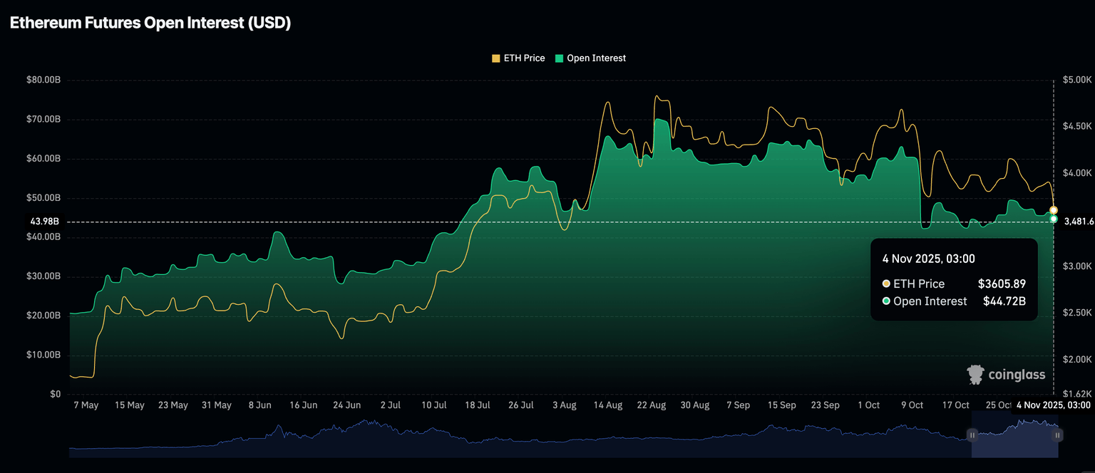 La demanda minorista de Ethereum también ha retrocedido significativamente, con el interés abierto de futuros (OI) cayendo a 44.720 millones de dólares desde el pico de octubre de aproximadamente 63.000 millones de dólares.
