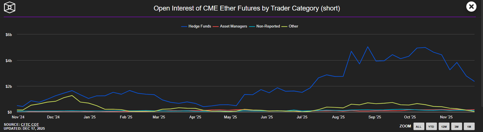 El interés abierto total de las posiciones cortas de ETH en el CME se ha contraído de aproximadamente 5.000 millones de dólares en octubre a 2.360 millones de dólares. La caída sostenida del precio en las últimas semanas ha podido llevar a la mayoría de los operadores cortos a cubrir sus posiciones. El interés abierto es el valor total de los contratos no liquidados en un mercado de derivados.
