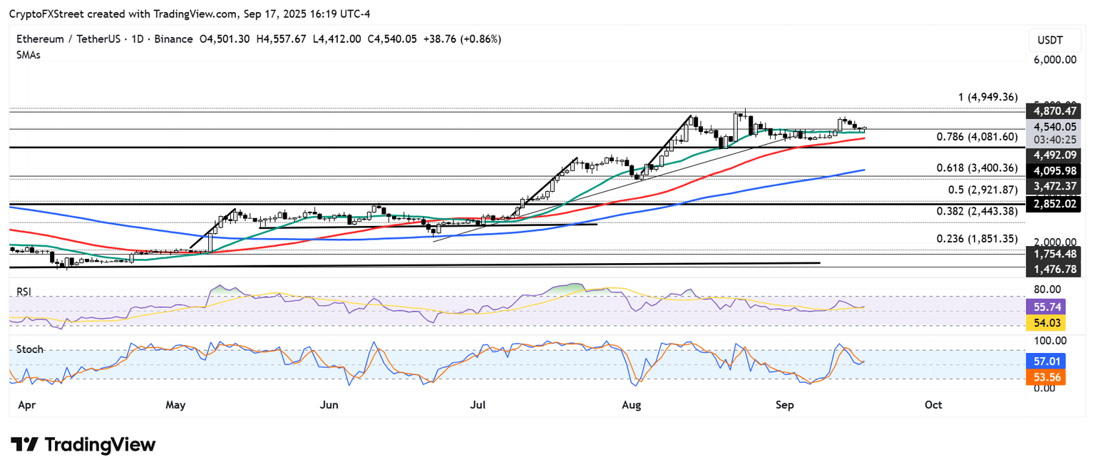 Pronóstico de Ethereum: Los toros y osos de ETH luchan en la SMA de 20 días y en la resistencia de 4.500$
