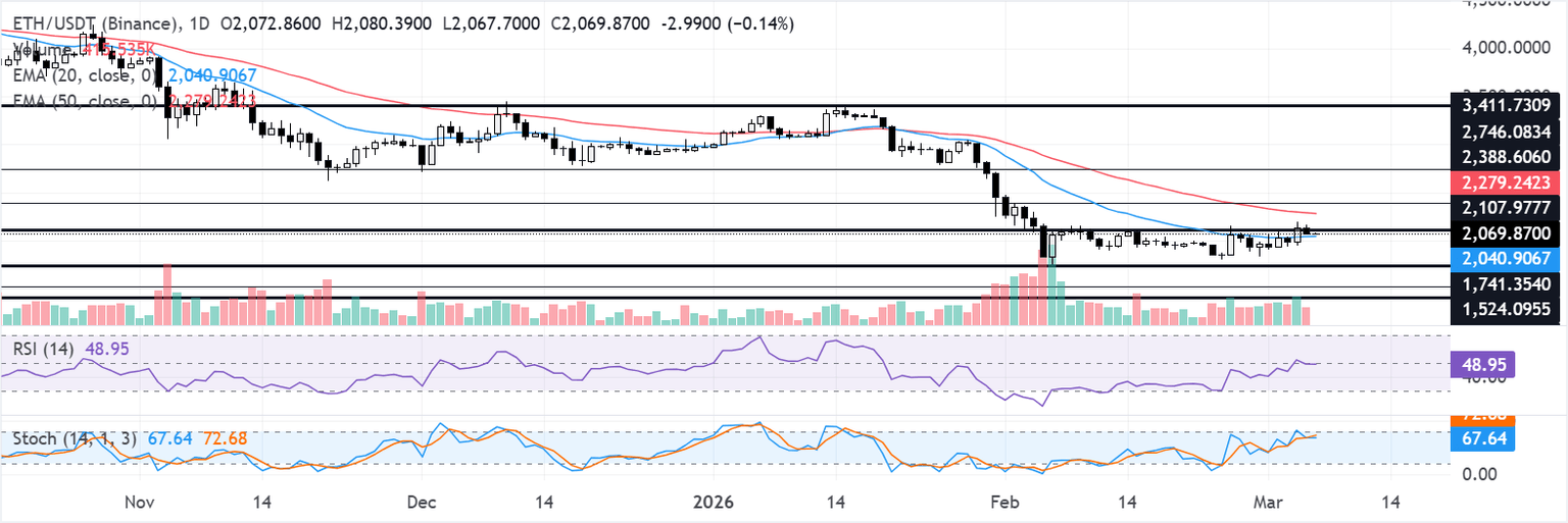 En el gráfico diario, ETH se negocia a 2.080$. El sesgo a corto plazo es neutral con una ligera inclinación alcista, ya que el precio se mantiene por encima de la reciente zona de 1.850$ mientras el momentum se estabiliza. El Índice de Fuerza Relativa (RSI) se ha recuperado hacia la mitad de los 40 desde territorio de sobreventa, y el Oscilador Estocástico (Stoch) se ha retirado de niveles de sobrecompra tras un fuerte rebote, sugiriendo una presión a la baja reducida pero no una tendencia alcista confirmada.