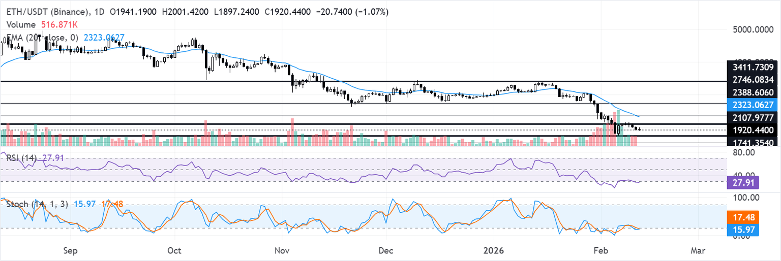 En el gráfico diario, ETH/USDT cotiza alrededor de 1.920$. El precio permanece atrapado por debajo de una EMA de 20 días en declive de 2.323$, reforzando un tono bajista a corto plazo. La pendiente descendente de la media continúa limitando los rebotes.