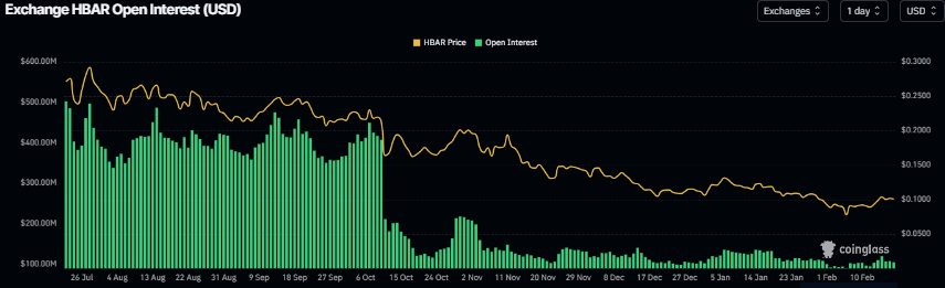 - Los datos de derivados sugieren una recuperación limitada, con el interés abierto de HBAR en niveles muy bajos junto a tasas de financiación negativas.
